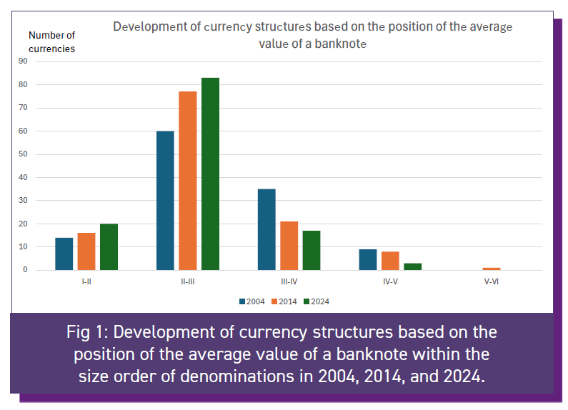 The currencies which had an average value of the note between the highest and second highest denomination were typically currencies which haven’t changed the denominational structure for quite a while. Because of gradual inflation, the popularity of the highest and second highest denomination had grown continuously, and the average value of a note had risen in the hierarchy above the second highest denomination. The graph shows that the incentive of central banks to issue new high-end denomination notes has decreased in the course of time.