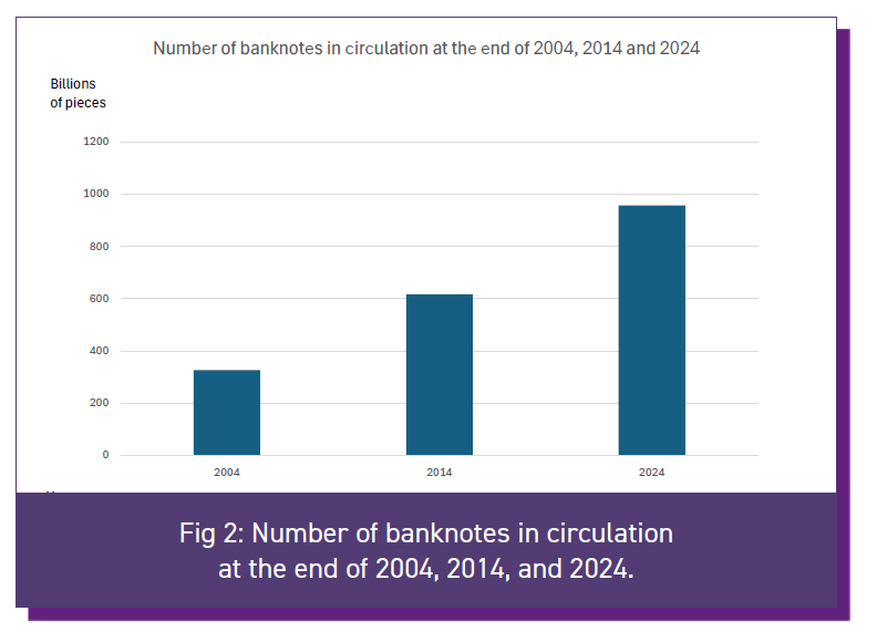 According to the study the number of banknotes at the end of 2004, 2014, and 2024 were respectively 325, 616, and 956 billion pieces. The percentual increase from 2004 to 2014 was 89%, and the respective increase during the more recent decade 55%. Hence, even if the growth rate has decreased, it has been on average 4.5% annually during the latter period.