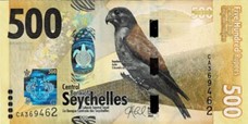 The Optiks thread in the 500 rupee of 2016 was laid over a transparent oval window in which was displayed the Seychelles vinegar fly. The holographic stripe that replaces it depicts a Hawksbill turtle, one of Seychelles’ most recognisable marine species. The turtle appears to move through stylised waves when the note is tilted.